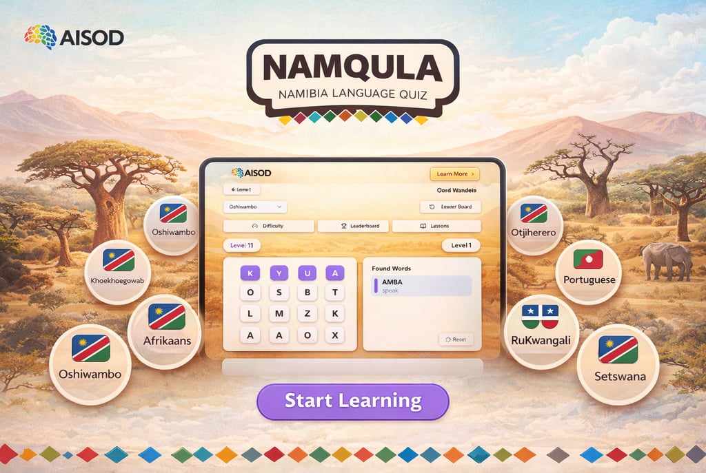NAMQULA is an innovative, open-source hybrid web and mobile application designed to promote and preserve Namibia's rich linguistic diversity. It achieves this through interactive word games powered by the AISOD AI-LRLM, which ensures accurate, culturally attuned language data. The app appeals to a wide audience, including language learners, Namibians, and global users interested in linguistic heritage.
